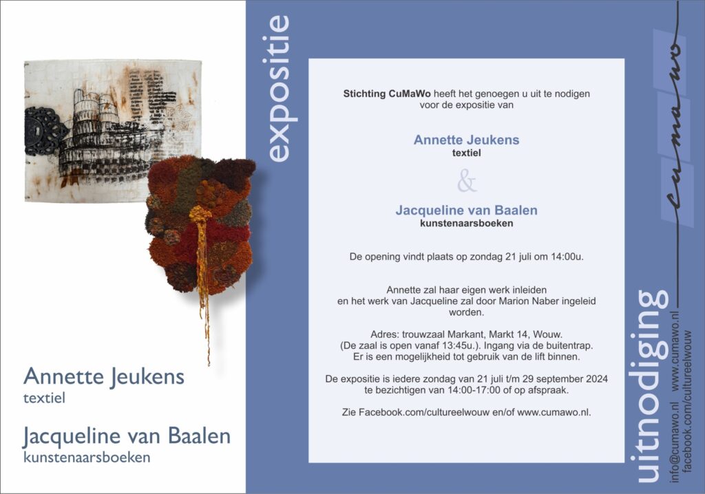 9 oktober opening expositie Annette Jeukens in Markant. Openingswoord: Karina van Vught Muziek: Annelies Arts en Jan Boter |